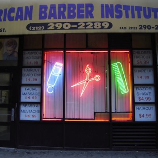 Well, today I decided I needed a haircut. So, I went on up and got myself one at the American Barber Institute. That’s right: Barber School. When I lived in the East Village I used to get my hair cut at the D&P Barber on 7th street and used to get blowouts at a joint on Avenue C that called it “big porn hair” and fed me cheap white wine, but nothing I’ve seen was quite like this. It was quite a scene. This is no Frederic Fekkai. It’s on a pretty desolate stretch of 29th street off of 9th avenue, neon scissors buzzing in the window, you go in and slide a few singles through the kind of plexiglass slot they have at liquor stores in bad neighborhoods, you get a ticket, and are led into a big room full of barber stations, red vinyl chairs, terrazzo floors, and men. Lots of men. Apparently they don’t usually take girls, but my barber- a sweet 18 year old named Everett Flint- has five older sisters and has been cutting their hair since he was 12… so… since I only needed a trim, I went for it. Did I leave feeling salon-fabulous? Not quite. But did I leave free of split ends feeling like I’d seen something pretty damn good today? Absolutely.