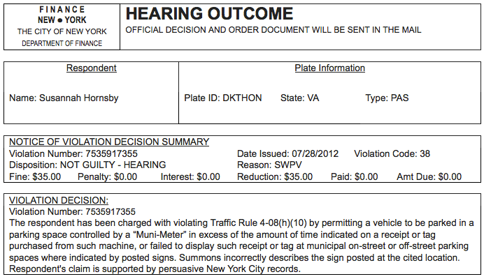 Perhaps my singlemost proudest moment as a citizen of New York City: I fought a parking ticket and won.