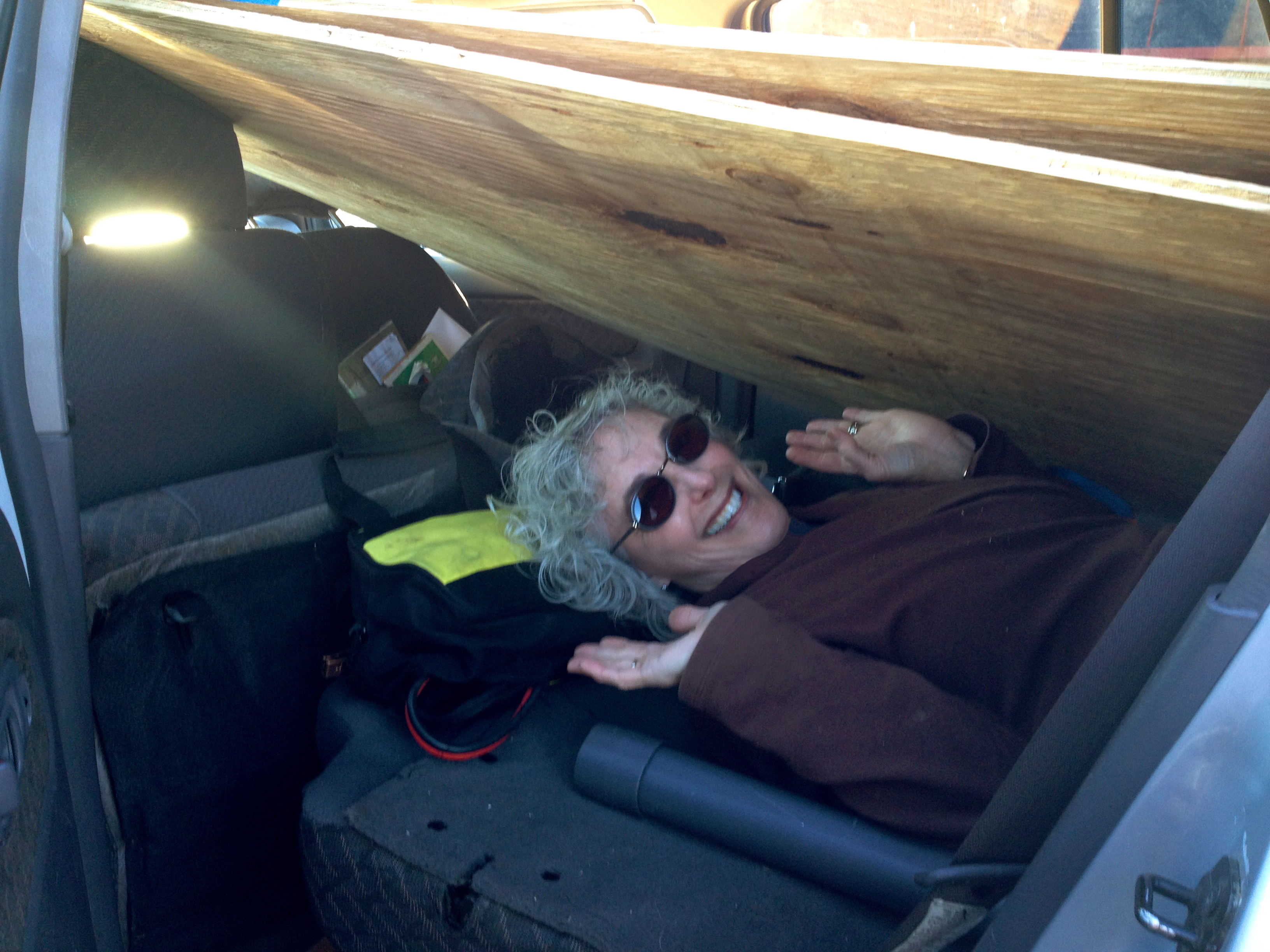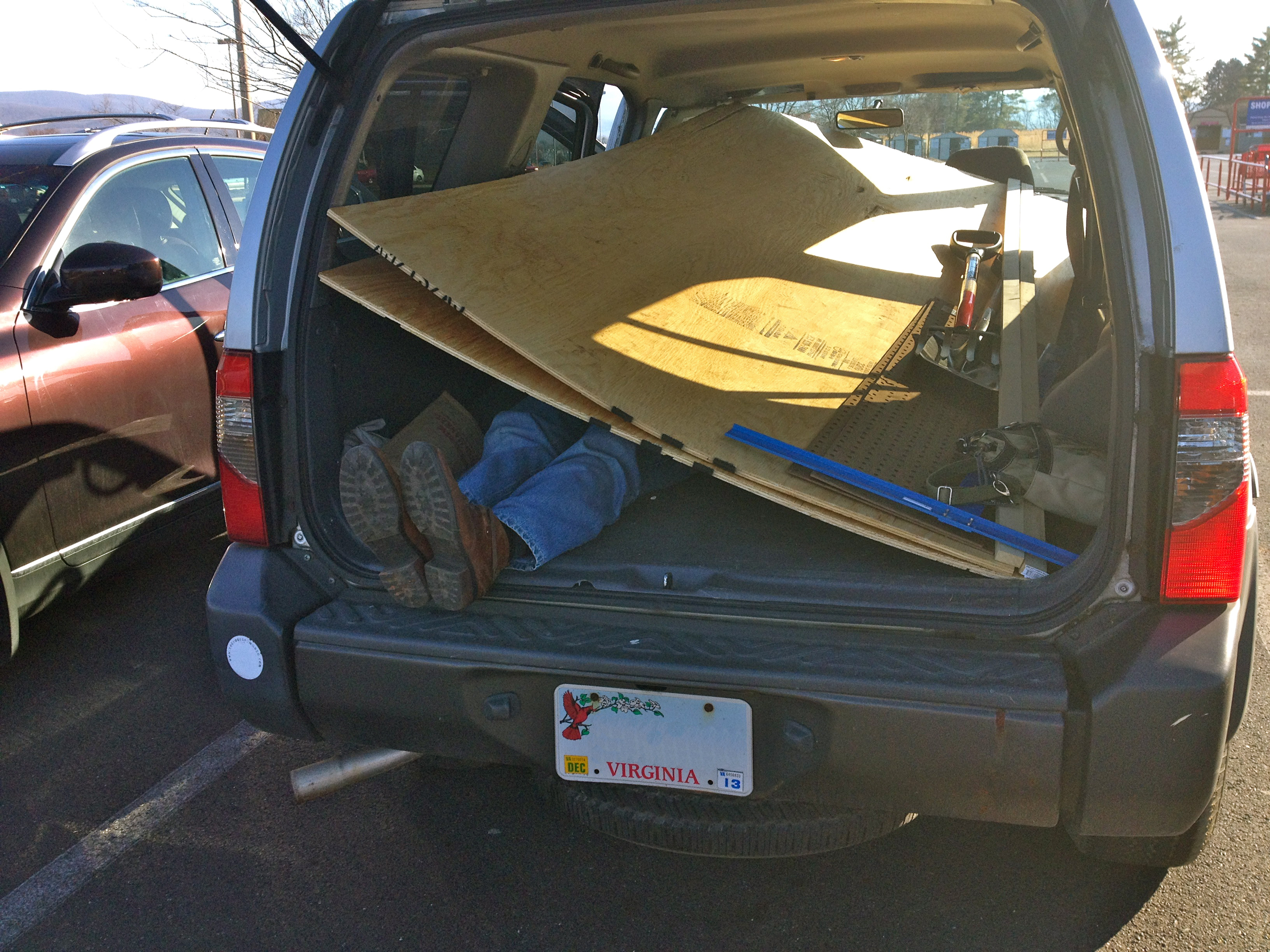 Lest anyone think from all of these Pollyanna-Meets-Laura-Ingalls-Wilder posts about getting the garden started and building compost sheds that I’m some sort of homesteading hipsturbian amalgam of Alice Waters and Bob Vila, let me just bring it back to reality with this. Should we take the little old pickup truck? No, the wood and stuff can definitely fit in my car. Ok. Well, it’s true, the wood CAN fit in the car, but only if we fold all the seats up like origami, take out front visors and headrests, oh, yeah, and if Mama rides in the back lying down under the two sheets of plywood. Oh my goodness we laughed all the way home. What a good way to start the weekend.