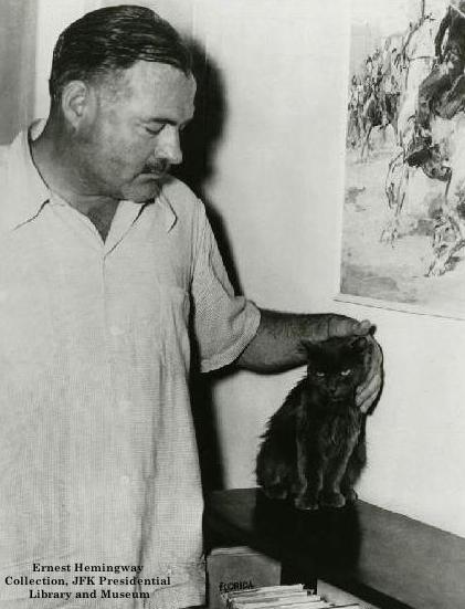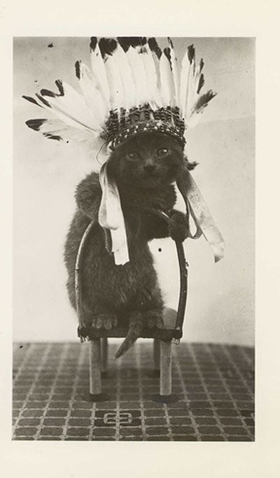 Thanks to Miss McKay for the New Yorker image, mugshot from here, Indian from here, Hemingway from here, Russell lounging is just Russell lounging, and Cat audition is from here.