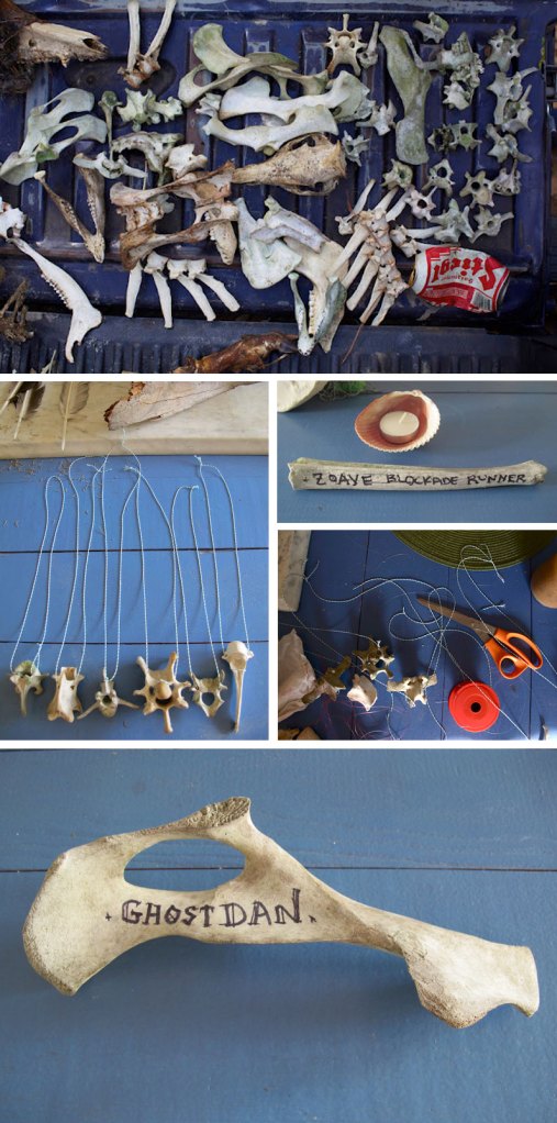 For Miss McKay’s birthday she threw a Ghost Party in the sea islands. All in attendance were asked to choose and channel one of the many spirits of Cumberland, the most mystical and undoubtedly magical tide and mist limned island of the lot. This was certainly cause for a most unearthly celebration. We went to the boneyard and gathered armadillo skulls, deer jawbones, and miscellaneous backbones from the woods, and, like all good ghosts, everyone had a bone necklace and placecard.
