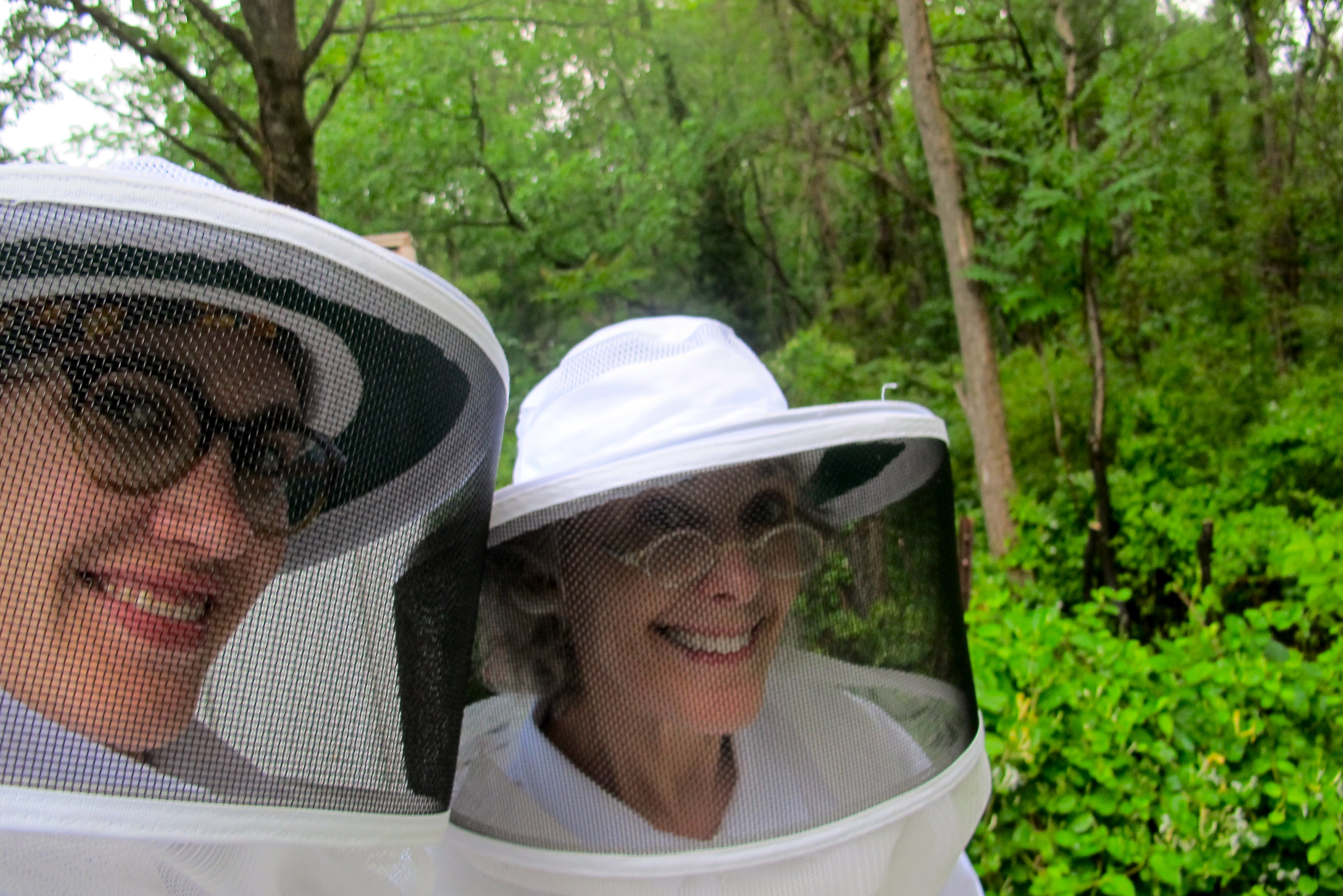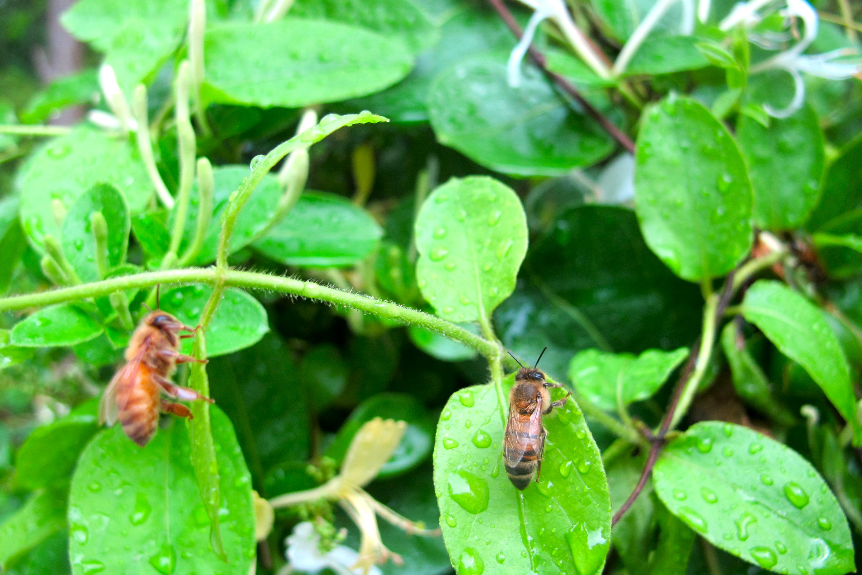 We puffed them with smoke to calm them down, then sprayed them with sugar water to zuzz them up and then moved them, slowly and surely, frame by frame, from their temporary cardboard hutches to their forever-homes. They immediately took up ancient established positions- some moved to the empty frames to start exploring, some situated themselves at the door of the hive, fanning their wings with a special perfume to let any sister-bees know that this was home, so come on in, and some of them alit on the dewey honeysuckle nearby to cool off after a hot night in cardboard city. Needless to say, after our very first time handling our very own bees, meeting our very own beauties, Mama and I are two very happy beekeepers.