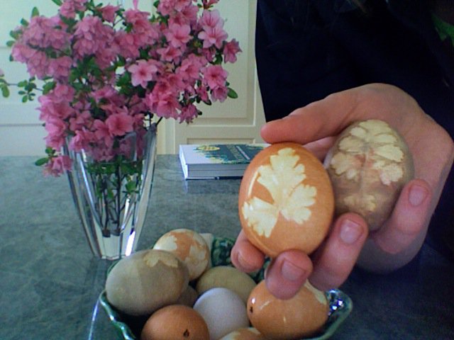 You will need: eggs, onion skins, a small stockpile of interesting leaves (parsley is easy to get in a city as well as the aforementioned), panty-hose or cheesecloth or gauze (I found a bunch of those footies you try on shoes with), rubber bands, some sort of ballast (I used loose change).