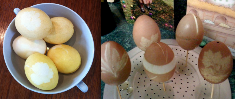-Nestle your egg into the panty-hose (or square of gauze/cheesecloth) and put in a couple of leaves flush with the shell. The leaves resting against the shell creates the relief outline, so use your imagination.
