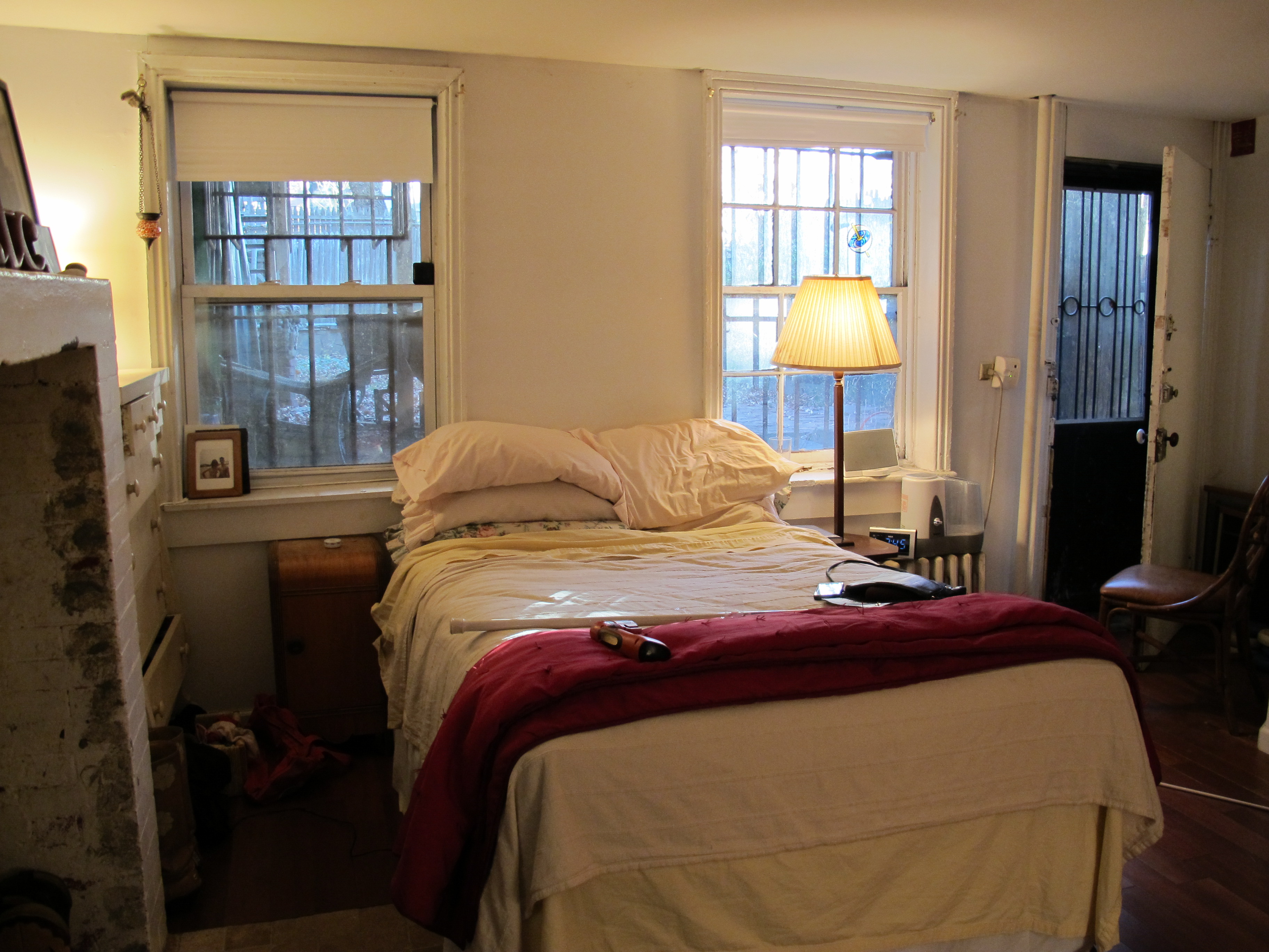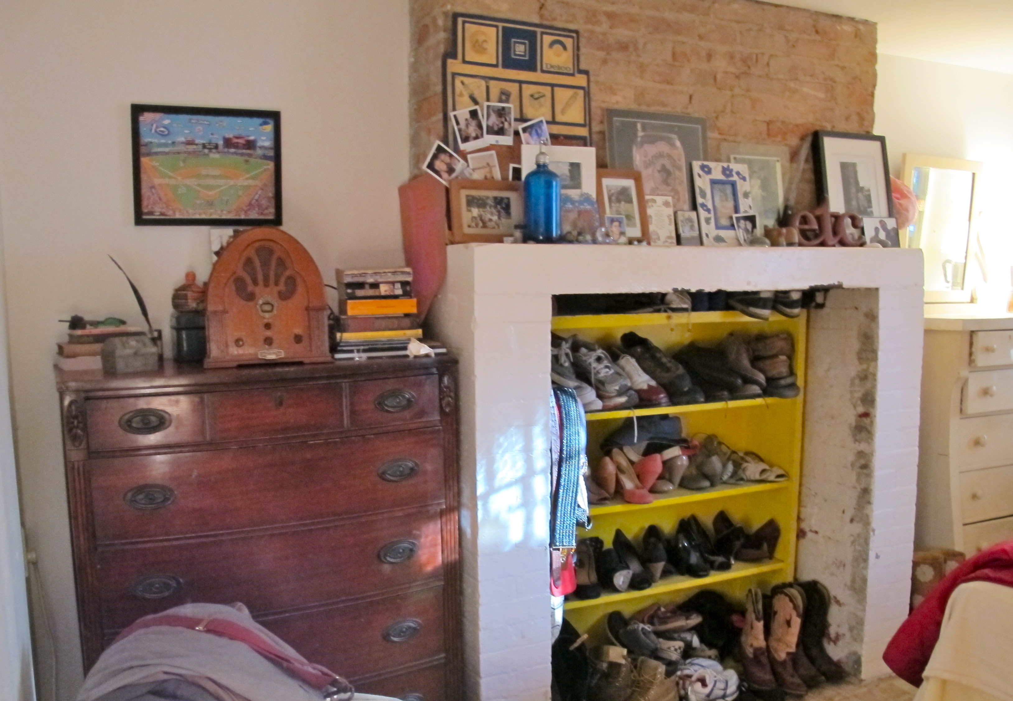 After Mama and I tackled DAS NORDEN and made my kitchen ship-shape, and after we un-antiqued the gnarly old secretary to turn it into a sweet desk fit for inspirational working, I turned my eye upon the bedroom Sauron-like. Wow. Looks sad. Not at all the kind of calm, adult space that feels like a respite from the madding crowd. Instead, it’s guilty of that kind of spatial inertia that grips a space after you move into an apartment and then… it just never changes. This was all compounded by the fact that I lived here for a year solo before Sweetheart moved in, so not only is the bedroom sort of tired, it’s also been sort of cobbled together out of necessity. The mandate: create a space that belongs to Sweetheart and I equally that is uncluttered, calming, functional, unified, and interesting. A good place to sleep, but also a lovely place to be. A place that is as bright as possible during the daytime while also being private at night… on the extreme cheap. That’s a tall order. The Bedroom, like the rest of the apartment, has a bizarre list of issues and perks all sort of stemming from the layout (I used this cool tool to make this little mockup on Apartment therapy): The major layout issues are: the decorative fireplace, the placement of the windows and the doors, and the existence of the radiator at all. This room was originally the main kitchen for the rest of the brownstone, so this fireplace is essentially one of those epic kitchen hearths large enough to hold an entire spitted pig. There are marks where the spit used to be. If only we could still use it to roast a whole hog. That sounds like a romantic bedroom activity. Unfortunately, the fireplace is now simply “decorative”, so when I first moved in the obvious function of this weird obsolete fire-hole was as a Carrie-Bradshaw-style shoe shrine, which was great. Over the past few years, though, I’ve acquired a) many, many more shoes and b) Sweetheart (and all of his shoes), so it’s gone from glorious to sort of gross.