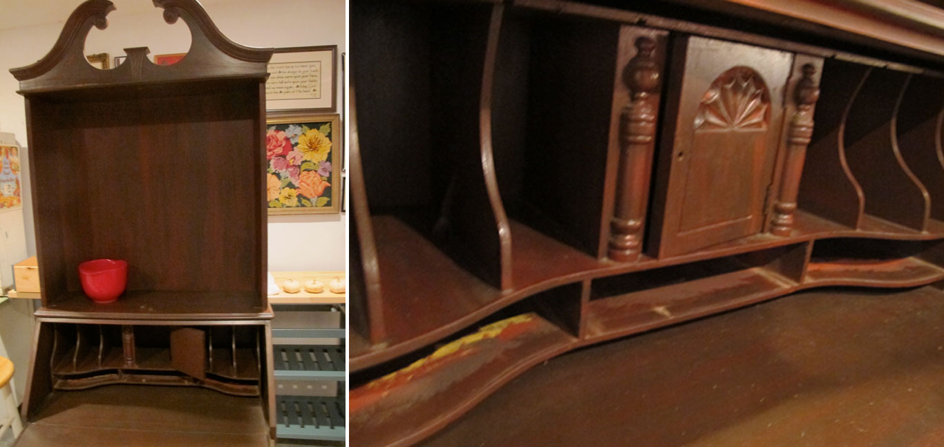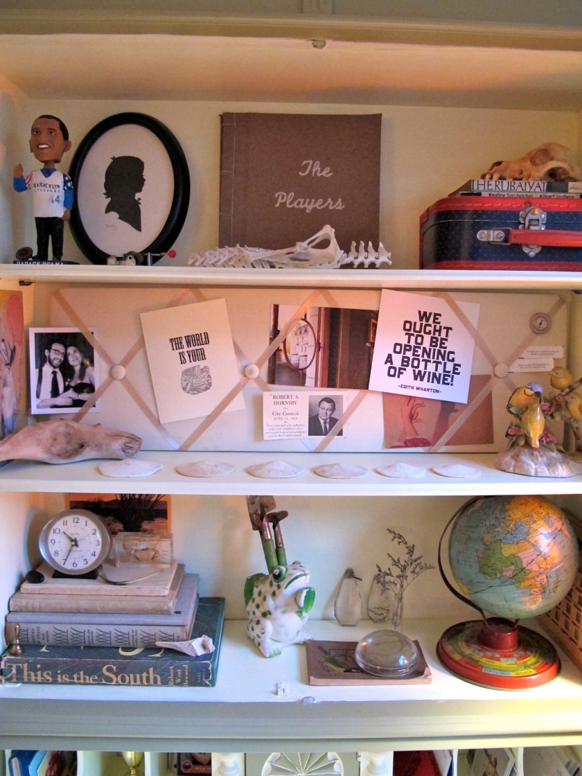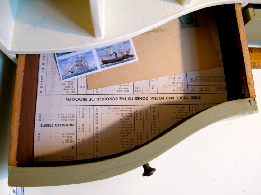 Then, of course, we let it dry overnight and drank some wine. Are you seeing a pattern? When it was all said and done, it was pretty much perfect:So much brighter, so much lighter, and so much more functional. This is my desk when it’s open, useful storage when it’s closed, and it’s also (by necessity) home to our DVD player/Netflix Machine. I sit at this desk for many hours every day, so, needless to say it’s lovely to love looking at it (I’m looking at it as I type this). The mouse house now houses my mouse and mousepad when I’m not using them:The little curvy drawers that were once yechy are now sweet, lovely, and useful (I lined them with some pages of an old New York City postal-code book I found):And- my favorite part- the curio cabinet up top holds all of my little treasures and miniature inspirations (like my Baracklyn Cyclones Obama bobblehead, an armadillo skeleton found on Cumberland Island, a collection of sand dollars gathered from the Vashon Island mud flats at low tide, a tiny compass from the Marché aux Puces, and the weird little frog watering can that I picked out from my Great-Grandmother’s house when I was 10, to name a few):Pretty darn good.