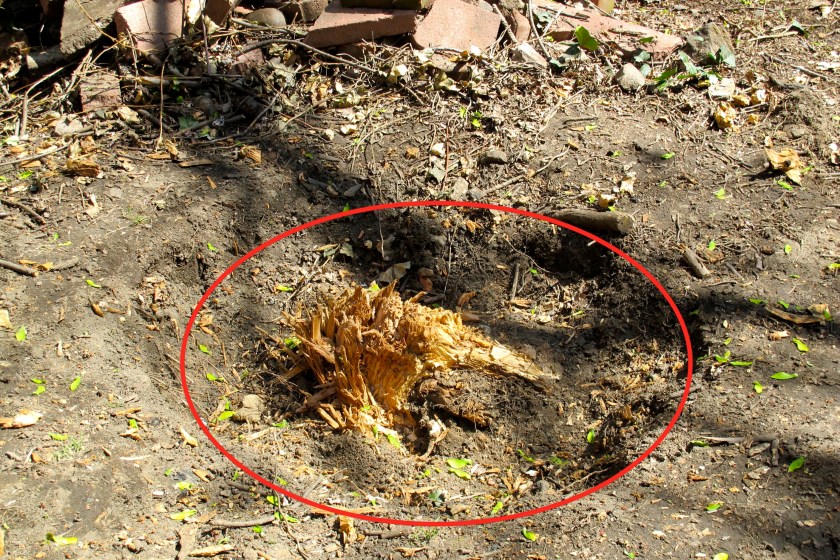 Then. I found the stump in my backyard. This old stump had at one point been burnt, covered in bricks and debris, forgotten until Sweetheart and I unearthed it in a torrent of centipedes and (my) shrieking. On Monday, it was the size of the red oval: