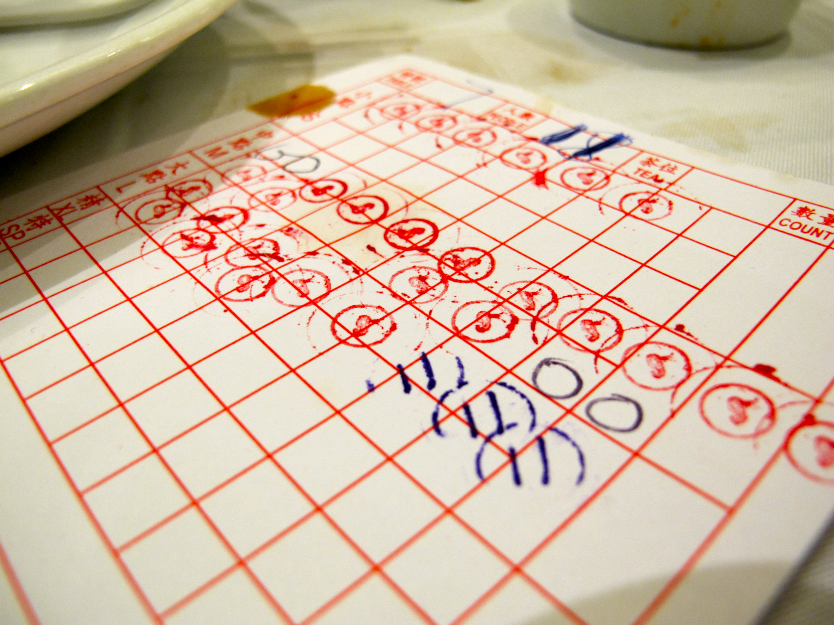 This paper represents what we ordered over three hours for lunch. Somewhere in those hieroglyphics are the aforementioned pork buns and chicken feet, shrimp dumplings, pork dumplings, vegetable dumplings, scallion dumplings, doughnut noodles (!), spicy squid, Chinese broccoli, garlicky bok choi, bean curd wraps, chili oil, Chinese winter sausage, fried shrimp with bacon, fish balls, sweet custards, sticky rice in lotus leaves, multiple coke classics, and eleven pots of tea- all ordered in Aunt Sheila’s perfectly wonderful Upper-East-by-way-of-Bensonhurst accented cantonese. She’ll tell you “I don’t speak cantonese, I only speak Dim Sum”. Repeat after me: Josh-eeuw-Baow (BBQ pork bun). That’s all you need to know.