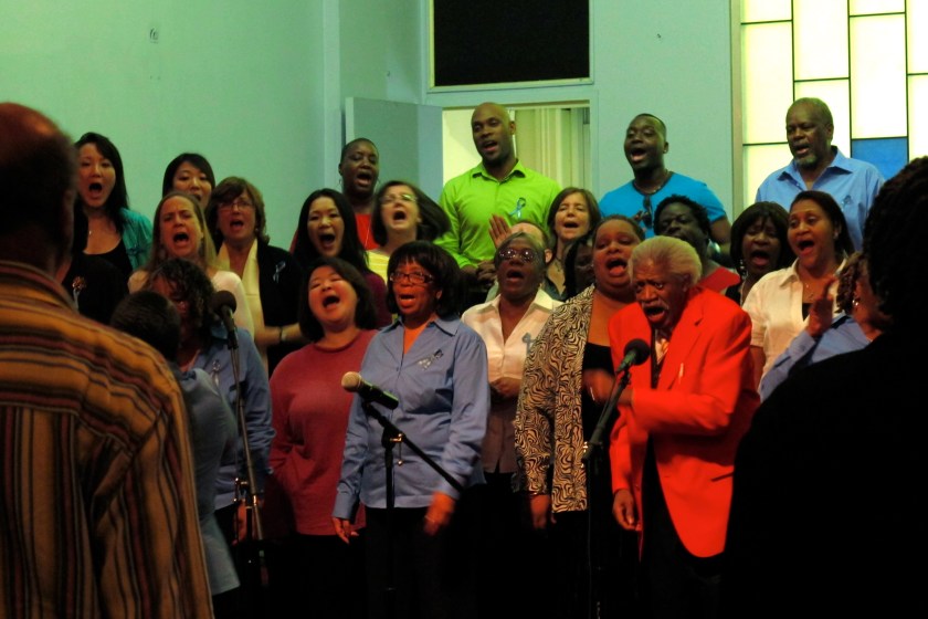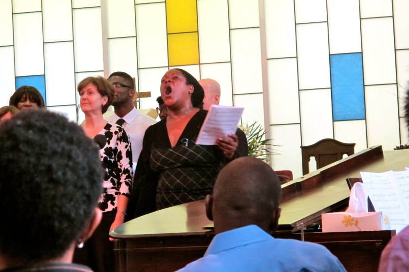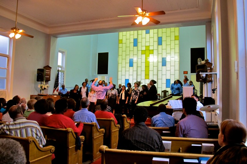Up several flights of stairs into a small but airy blue sanctuary with high windows, the singing hasn’t started, but the drums and organ are warming up, seats full and pews stocked with paper fans from the local funeral home. Needless to say, getting the spirit raises temperatures. Amen. This Saturday I met Carrie up in Harlem for the fourth annual gospel choir festival at the Elmendorf Reformed Church. Our friend Laura was singing, the proceeds went to autism research, and the noise promised to be joyous unto the lord and anyone else who might be listening. The church itself (now in its fifth home uptown) was founded 350 years ago, and, as the MC Elder Kevin Spooner said “it feels like some of us have been here that long”. Amen. Four choirs. Organ, piano, bass, drums.The crowd instructed to sing out if the spirit moved us, and moved we were. And afterwards, we waltzed out into the warm Saturday Harlem night to Sylvia’s for fried chicken. Amen.
