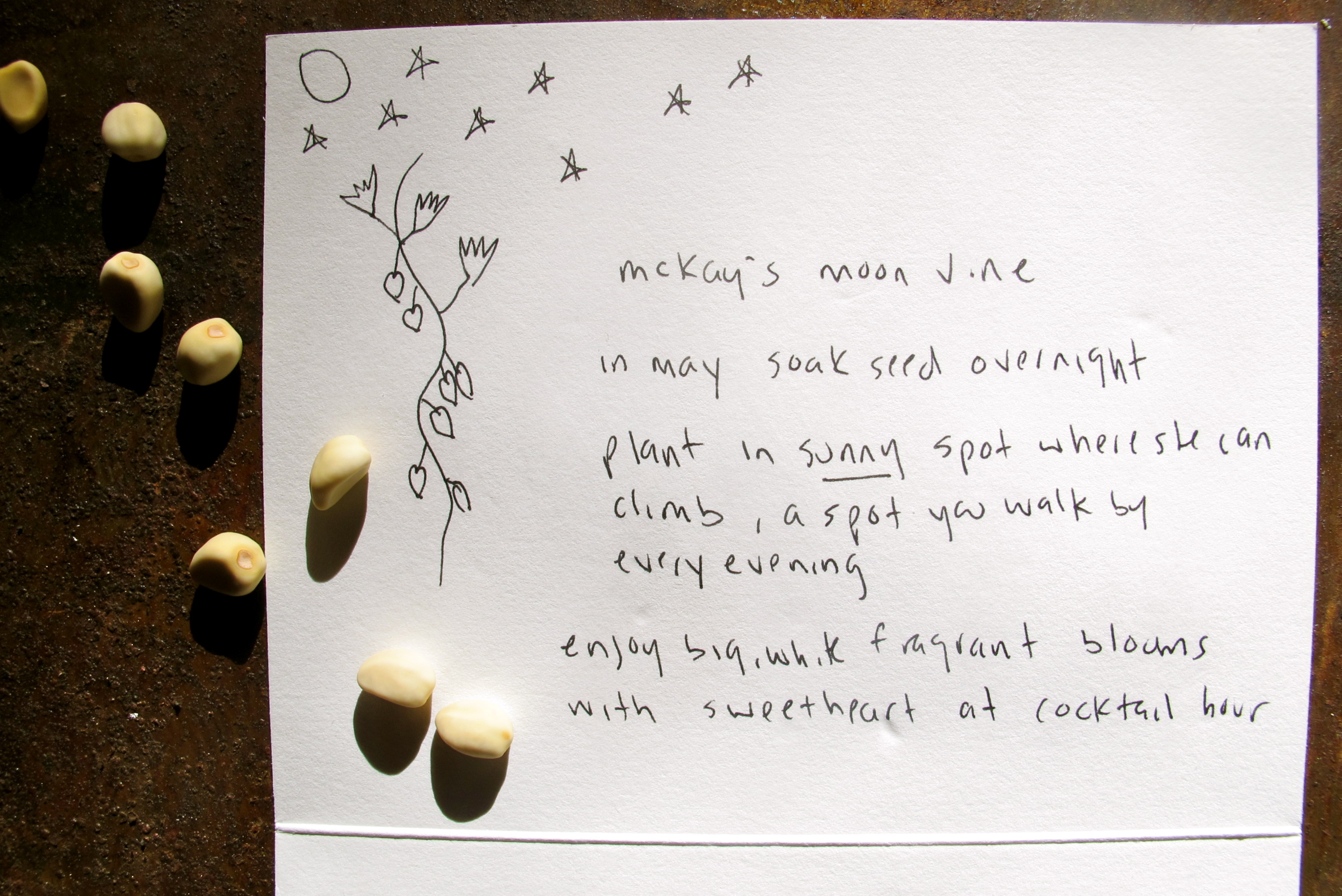 In the short almanac days of dark December, a care package came from Miss McKay. A burnished new short story and a bright yellow envelope, rattling and full of purpose, marked “open with care”. Inside the envelope, a dozen (magic?) seeds, labeled McKay’s Moon Vine, and accompanied by these instructions: