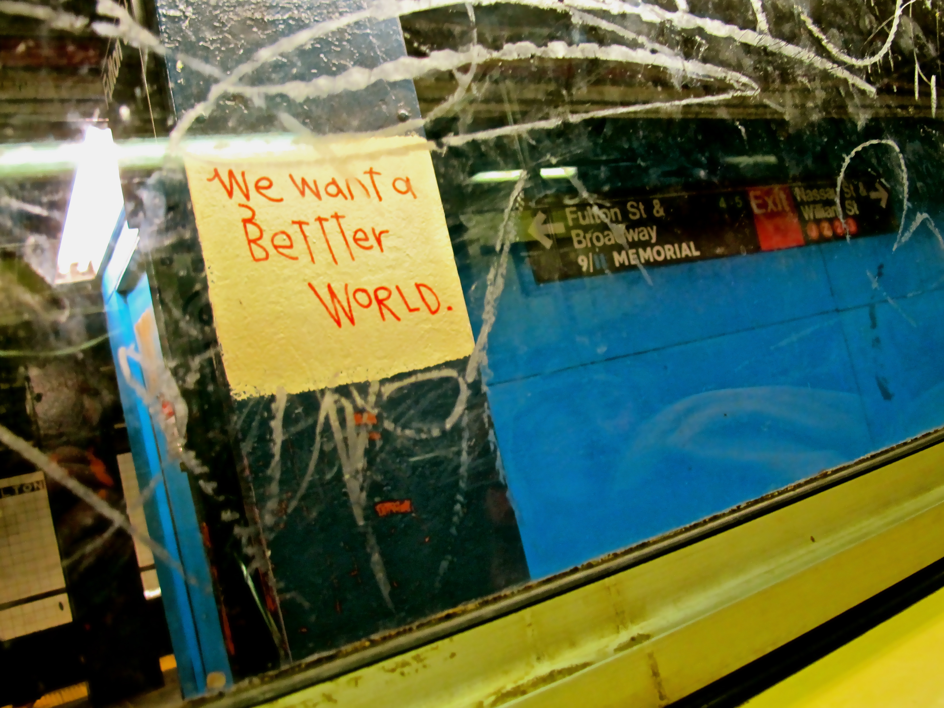 Such a simple message. We Want a Bettter World. Was it written by the Occupiers? A blunt reminder of how far we’ve come (and how much is still lost) in the last ten years? A mandate in time for Christmas? Whatever it is, it feels bittersweet, but it also feels hopeful. We Want a Better World. Me too.