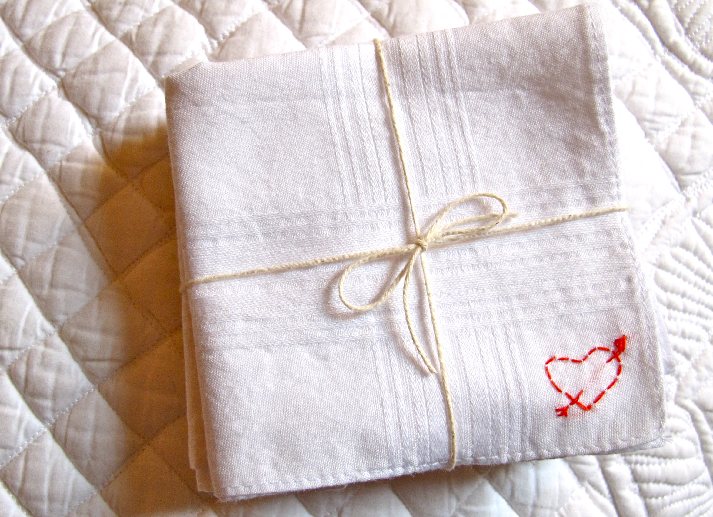 My grandfather carried a handkerchief, and I think it’s a special, sweet, old-fashioned, and useful little thing- harkening back to an age of simple and elegant manliness. You can give it to a crying woman on a bench somewhere, entertain a small child, mop your brow, smooth the neck of a guitar, pick up a handgun at a crime scene like it’s 1939, wrap up a sweet treat to go, put it up your sleeve or suit pocket, perform sleight of hand, or (obviously) blow your nose. This Valentine’s Day, I gave Sweetheart a parcel of plain white cotton handkerchiefs that I clumsily embroidered- three with hearts and three each with funny squashed A’s on them (his initial), because I think he’s all of these things- sweet, old fashioned, simple, and manly. This little project was easy and fun- I knocked out the embroidery drinking beer and watching Downton Abbey (reveling in both my emancipation and my needlepoint). If you’re a crewel mistress, you could make these pretty fancy, but you really only need a simple running stitch to keep it manly. Get 100% cotton hankies, wash them and iron them first, double the thread, and just freehand the hearts. And, hey, it’s not 1800, if they turn out a little crookedy, that’s ok.